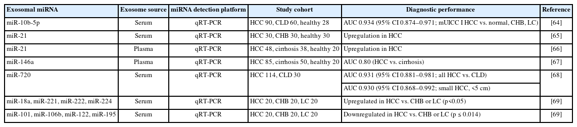 - 68. Jang JW, Kim JM, Kim HS, et al. Diagnostic performance of serum exosomal miRNA-720 in hepatocellular carcinoma. J Liver Cancer 2022;22:30-39.