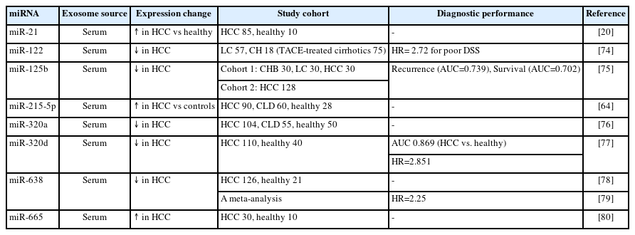 - 71. Wang S, Yang Y, Sun L, Qiao G, Song Y, Liu B. Exosomal microRNAs as liquid biopsy biomarkers in hepatocellular carcinoma. Onco Targets Ther 2020;13:2021-2030.