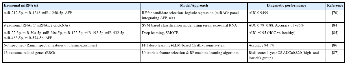- 85. Hwang JS, Lee S, Kim G, et al. A serum exosomal microRNA-based artificial intelligence diagnostic model for highly accurate detection of hepatocellular carcinoma. Cancer Commun (Lond) 2025 Jun 26. doi: 10.1002/cac2.70043.